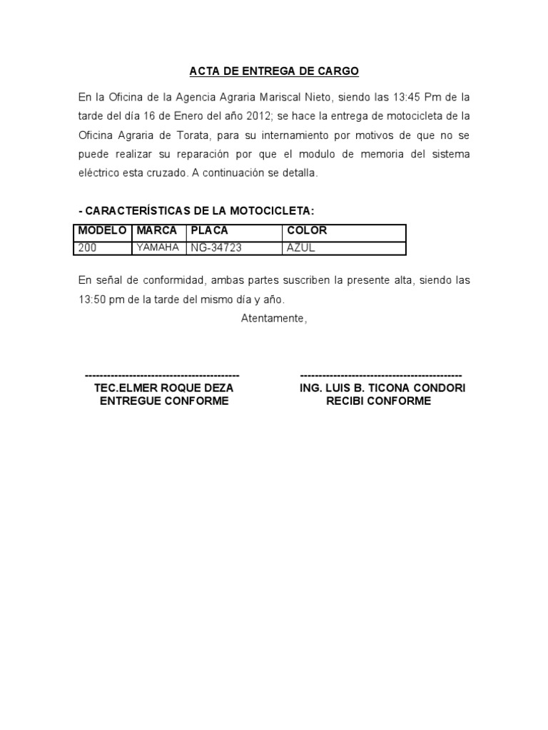Acta De Entrega De Cargo De Motocicleta Del Señor Te.elmer via es.scribd.com